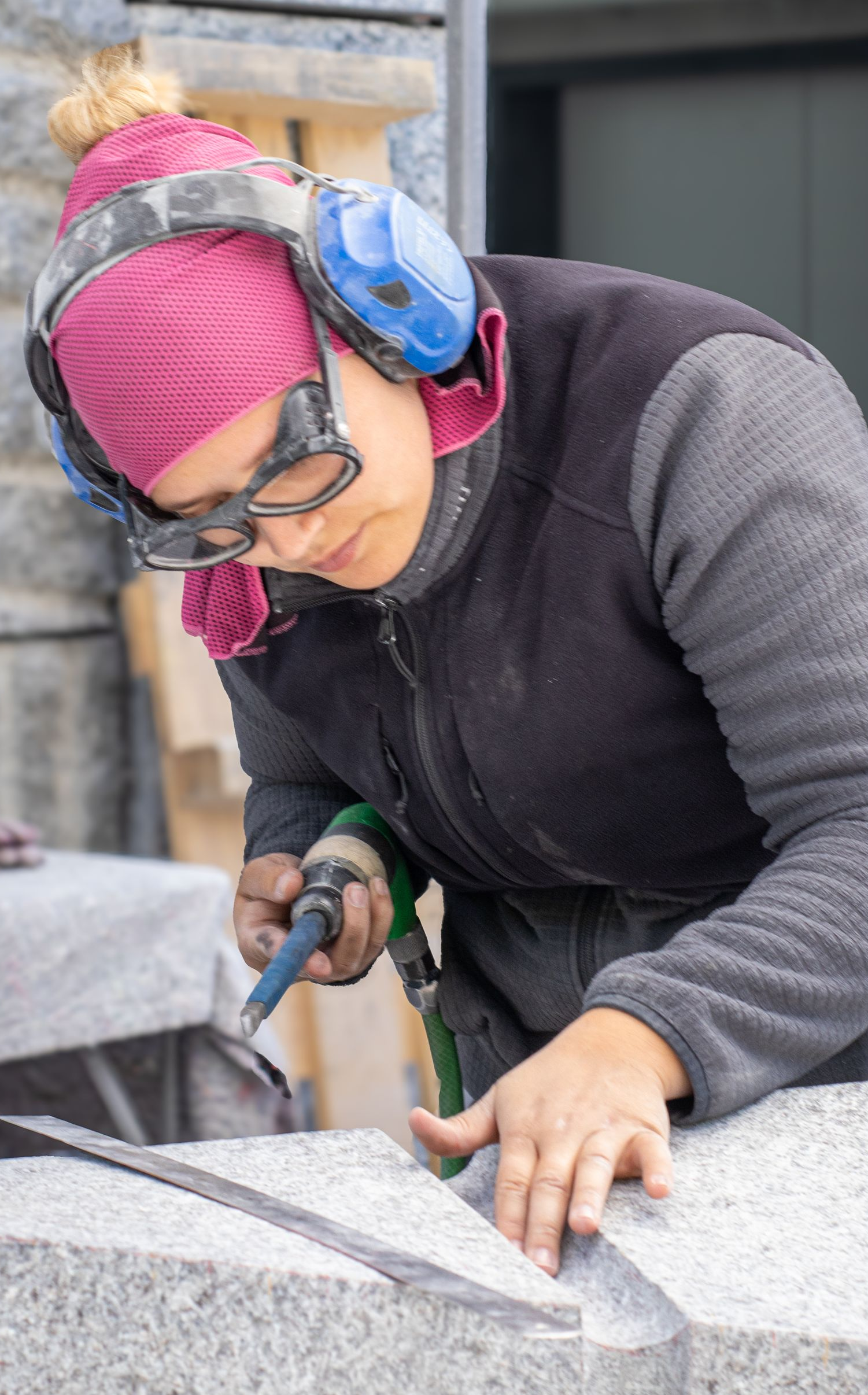 Als Frau sei es etwas Besonderes, sich für den Beruf als Steinmetzin zu entscheiden: „In unserem Kurs in Wunsiedel waren wir neun Personen und nur drei Frauen.“ Sie sehe das aber nicht als Nachteil. „Oft arbeiten Frauen genauer und haben ein Auge für Details“, erzählt Kuhn. Das sei etwa bei feineren Arbeiten wie Schriften wichtig. „Wenn man kein Köpfchen hat, profitiert man auch von den Muskeln nicht.“ Schließlich müsse man in der Werkstatt überlegen, wie man seinen Rücken möglichst gut schonen kann.